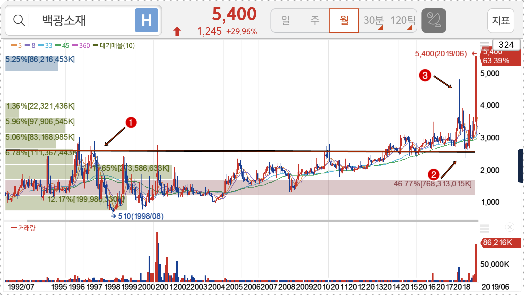 일봉으로 그림을 좁혀보죠. 의미 있는 구간이 눈에 띄는데요. 1번 가격대에서 몇번인가 헤맨 적이 있습니다. 대량의 거래를 동반한 기억도 있고요. 꽤 오랫동안 바닥을 다졌습니다. 2번을 보면 이제 이 가격대가 지지대로 작용한 것을 확인할 수 있는데요. 반짝 상승 이후 반락하더니 지지를 받으면서 더욱 큰 도약을 했습니다. 거리를 조금 더 좁혀보죠.