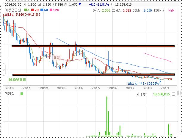 뚜렷하게 보이는 저항대가 보입니다. 1차적으로는 현 가격의 2배는 되야 다다를 수 있는 600원대가 1차 고비로 보이고요. 2차 고비는 한없이 높아 보이는 2,700원대입니다. 대량거래를 동반했던 2015년 후반 가격대가 매물이 몰려 있을 가능성이 높아서 1,800원대도 저항선으로 일단 꼽아 봅니다.