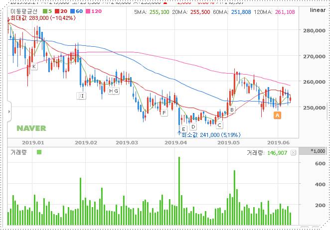 차트를 보면 이게 과연 테마를 탄 주식인가 싶을 정도로 상승폭이 미미합니다. 오히려 2019년 들어서 이동평균선이 정배열해서 떨어지고 있었는데요. 최근 2~3개월 사이 반등해서 회복하고 있는 모양새입니다. 이런 모양은 KT도 마찬가지입니다. 소문난 잔치에 먹을게 없는 셈인데요.