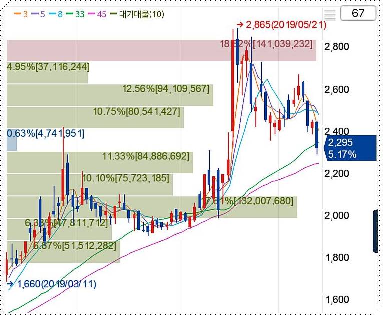 계절적인 요인을 제외하고는 왜 급하게 올랐는지 모를 기업인데요. 고점에 매물이 많이 몰려 있어서 전형적인 흐름이라면 2,300원대에서 지지를 받고 2,865원대에서 저항 받은 뒤 다시 제자리로 돌아가는 흐름이 예상됩니다. 최근 고점이 거의 역사적으로 반복됐던 고점이라는 것이 더욱 그렇게 될 것 같다라고 의심하게 하는데요. 지켜 볼 일입니다.