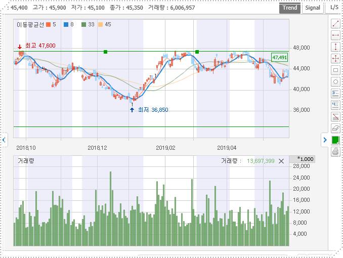 일봉으로 놓고 보면 월봉에서 보이지 않던 저항선이 보이는데요. 4만 7천원대입니다. 최근 2년 동안 3번이나 터치했다가 미끄러지기를 거듭했던 자리인데요. 굳이 매물대를 보지 않아도 이 정도면 이 가격대에 매물대가 엄청 몰려 있겠구나하고 추측할 수 있습니다. 지난주에는 천만 이상의 거래량을 자랑하며 하락 마감했는데요.