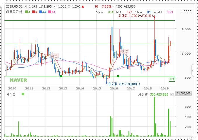 전체적인 그림을 봐서는 그리 쉬운 그림은 아니군요. 일단 현재 가격대가 굉장히 큰 저항대로 보입니다. 2010년부터 카운트를 해 봐도 벌써 5번째 시도인데요. 강하게 돌파하지 않는 이상은 그 위로 올라가기는 힘들어 보입니다. 제대로 넘어서는지 여부가 중요해 보이는군요. 최저가격은 422원을 기록했습니다. 1/3가격이군요.